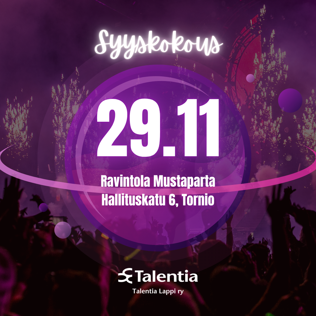 Talentia Lapin syyskokous pidetään 29.11.2024 Torniossa Ravintola Mustaparrassa. Syyskokous tapahtumineen alkaa klo 16.30. Luvassa on sääntömääräisten käytäntöjen lisäksi kolmen ruokalajin illallinen sekä liput Benjaminin keikalle illaksi Ravintola Umpitunneliin!