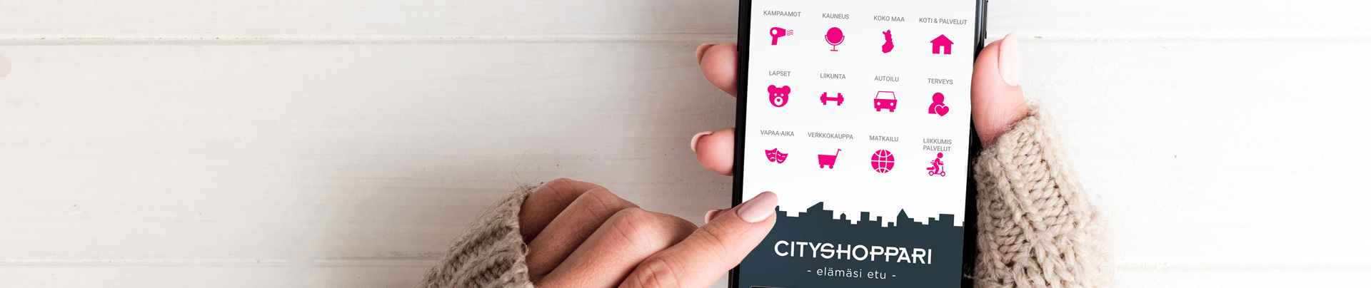CityShoppari-sovelluksesta löydät rahanarvoisia etuja, joilla syöt ja shoppailet edullisesti ympäri Suomen. Mukana mm. ravintoloita, kahviloita, hotelleja, kylpylöitä, vaateliikkeitä, verkkokauppoja, liikuntapaikkoja, kulttuuria, palveluita, kauneushoitoloita ja kampaamoita – jokaiselle jotakin!