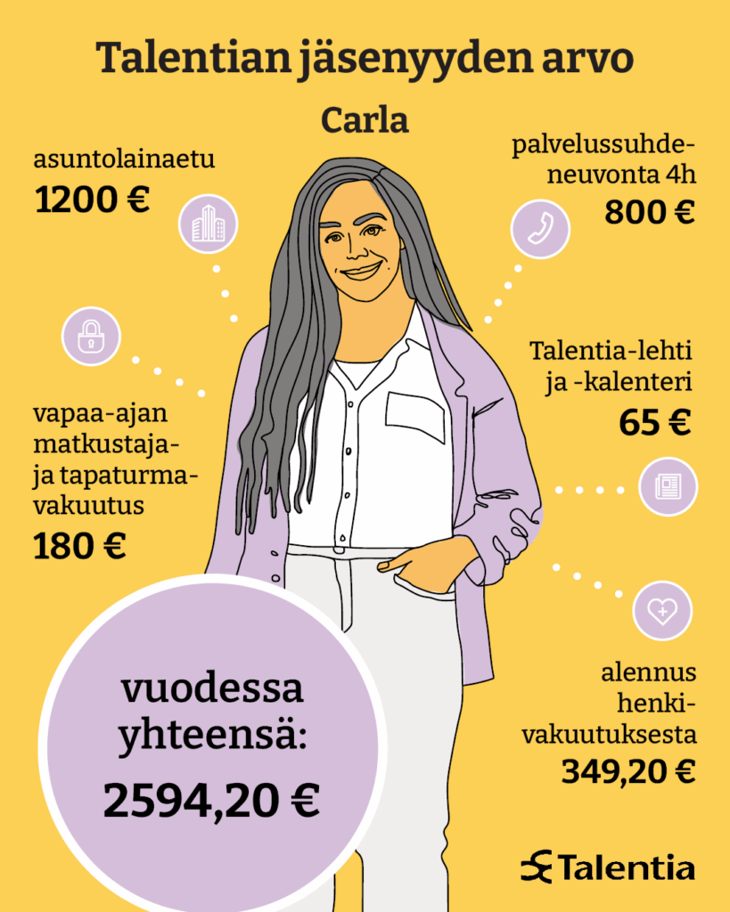 Talentian jäsenenä saat enemmän. Jäsenmaksun hinnalla voit luottaa, että etuasi valvotaan ja pääset hyödyntämään kymmeniä rahanarvoisi jäsenetuja.