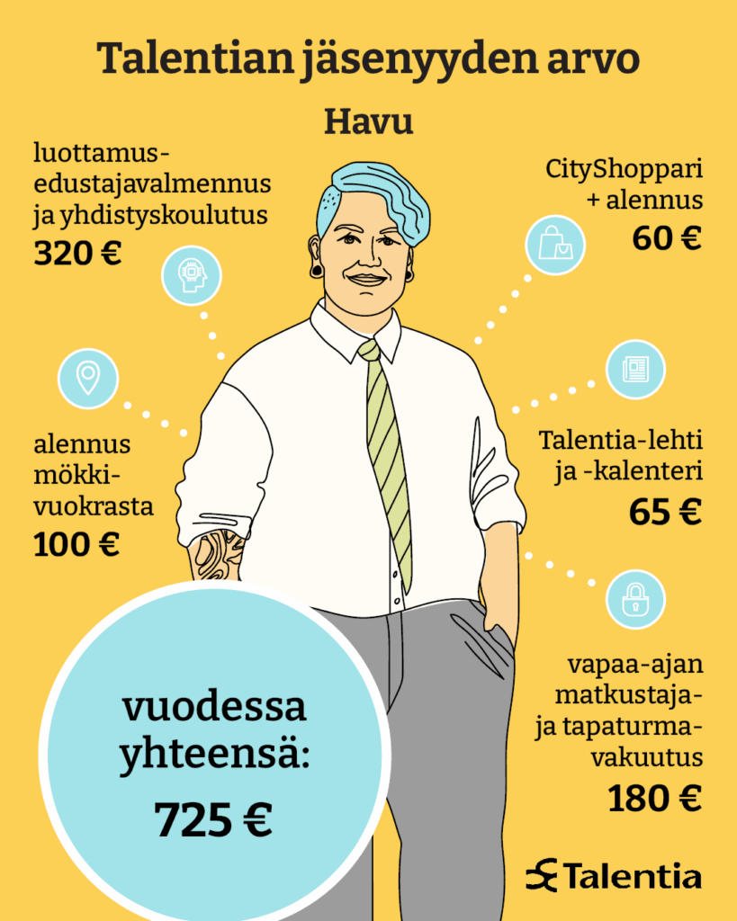 Talentian jäsenyys on tuonut Havulle merkittäviä etuja ja vahvistanut hänen ammatillista yhteisöään. Hyödyt ulottuvat niin työelämään kuin vapaa-aikaan. Jäsenyyden rahallinen arvo: 725 euroa!*