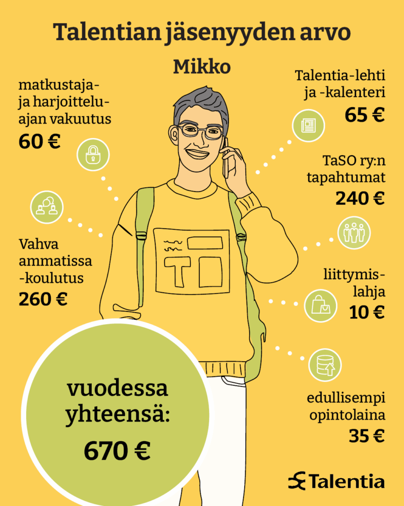 Mikko on ollut tyytyväinen Talentian jäsenyyteen: se on tuonut hänelle arvokkaita etuja, ammatillisia verkostoja ja tukenut hänen opintojaan. Talentia-lehti tarjoaa hyödyllistä tietoa, ja jäsenyyteen kuuluvat vakuutukset säästävät rahaa. Mikko kokee olevansa osa välittävää ammatillista yhteisöä – jäsenyyden hyödyt ulottuvat niin työelämään kuin vapaa-aikaan. Jäsenyyden rahallinen arvo: 670 euroa!*