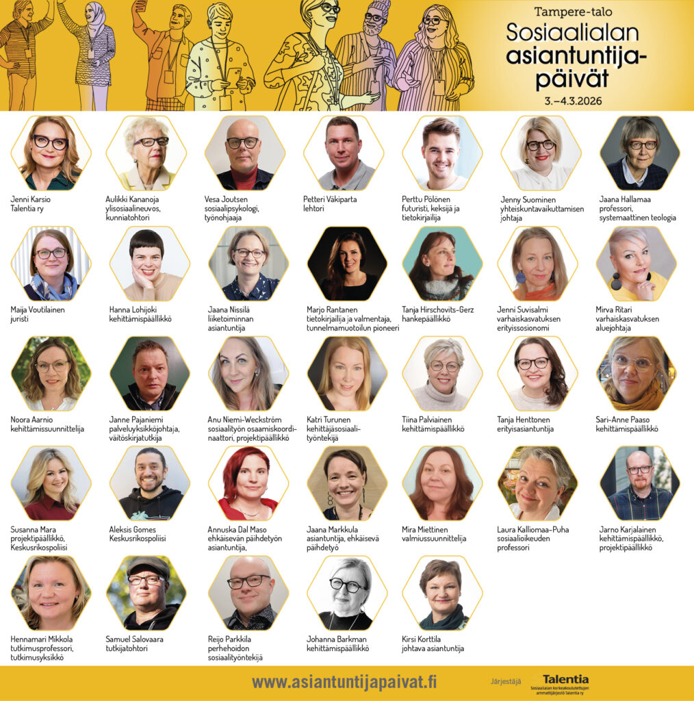 Sosiaalialan asiantuntijapäivät järjestetään 3.-4.3.2026 Tampereella. Asiantuntijapäivät ovat vakiinnuttaneet paikkansa sosiaalialan ammattilaisten kohtaamispaikkana ja tapahtuma on myyty loppuun useana vuonna.