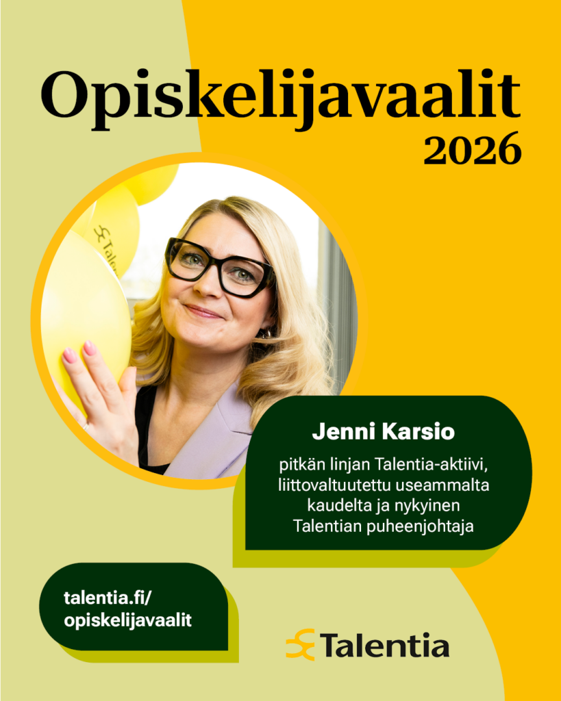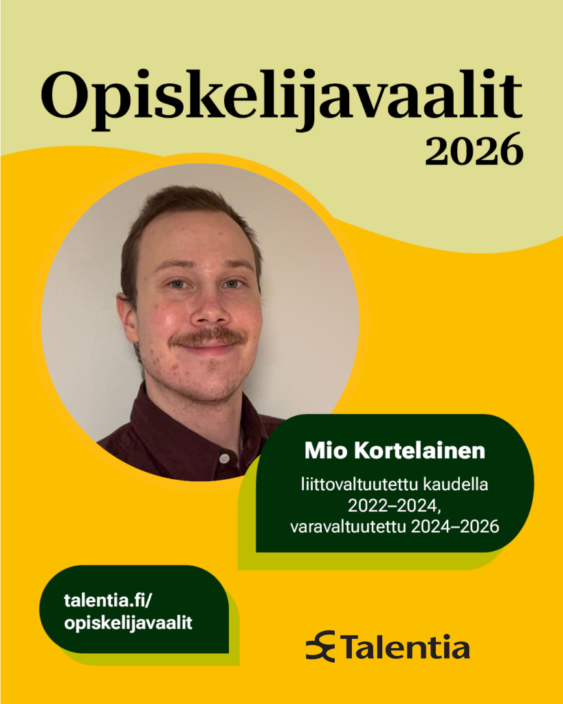 - 1.3.2026 Äänioikeus määräytyy, eli kaikki viimeistään 1.3.2026 Talentiaan liittyneet opiskelijajäsenet saavat äänestää kevään opiskelijoiden liittovaltuustovaaleissa.