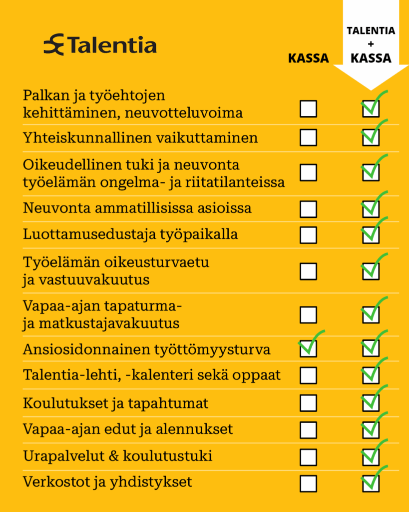 Talentia vai kassa? Tarvitset molemmat! Talentian ja työttömyyskassan jäsenyys turvaavat työelämääsi kokonaisvaltaisesti.