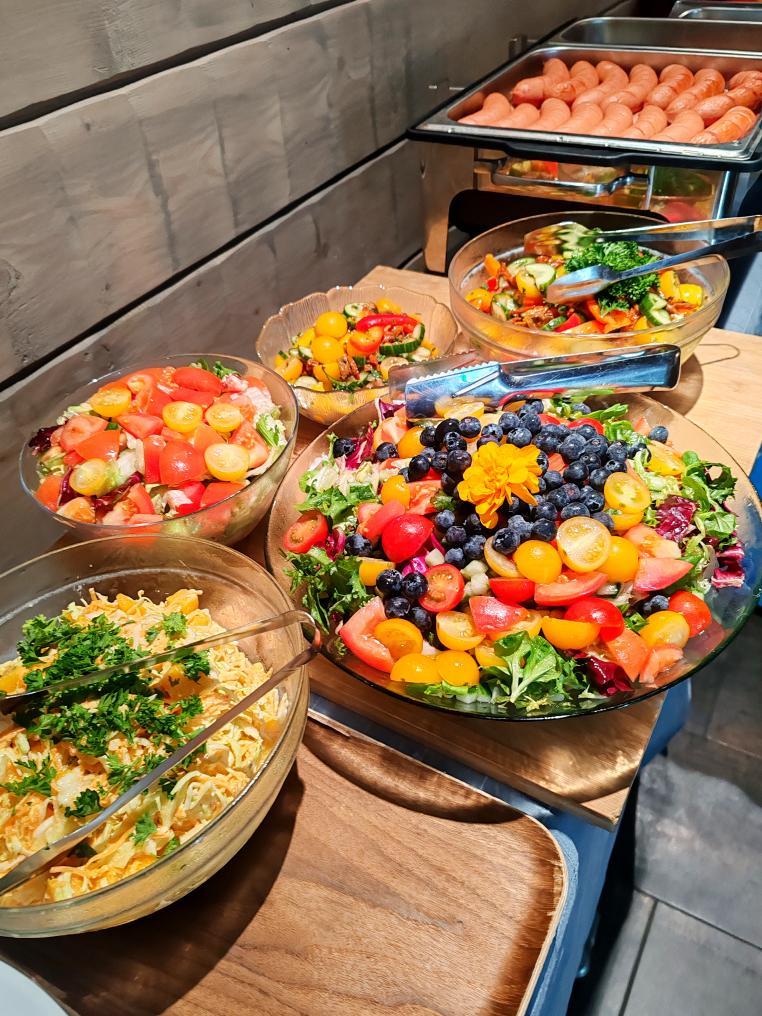 Illan kruunasi erittäin runsas salaattipöytä ja makkarat.