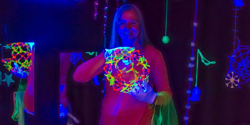 Sitten siirrytään pimeään huoneeseen. Musta tila aukeaa jännittävänä. Seinillä hohtaa hämähäkinseittejä ja erilaisia kuvioita. Monican hampaat ja hänen käsiinsä vetämät vitivalkoiset käsineet hohtavat aavemaisesti pimeässä fluorisoivan valon ansiosta.