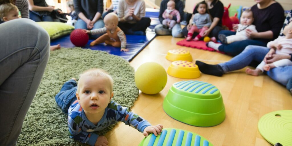 Kohta äitejä ja vauvoja alkaa saapua. Jumppasali täyttyy kahdestatoista vanhemmasta ja heidän pikkuväestään.