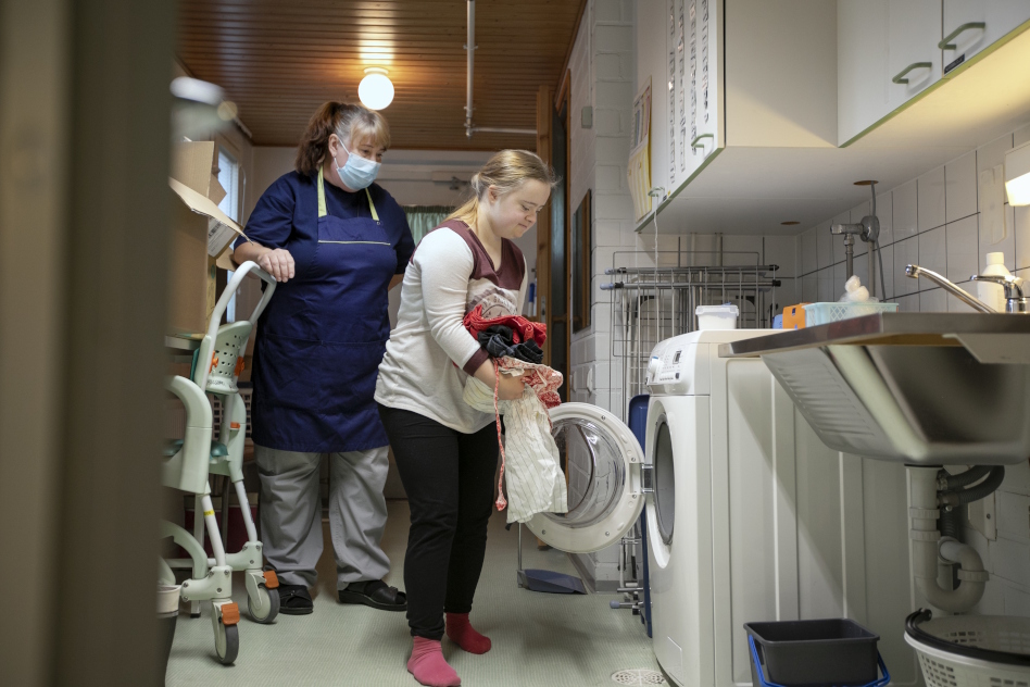 Pyykinpesu onnistuu Enna Danielssonilta jo hienosti, kehaisee lähihoitaja Kristiina Railo Haukilahdenrannan asumisyksikössä Espoossa. Kuva: Annika Rauhala