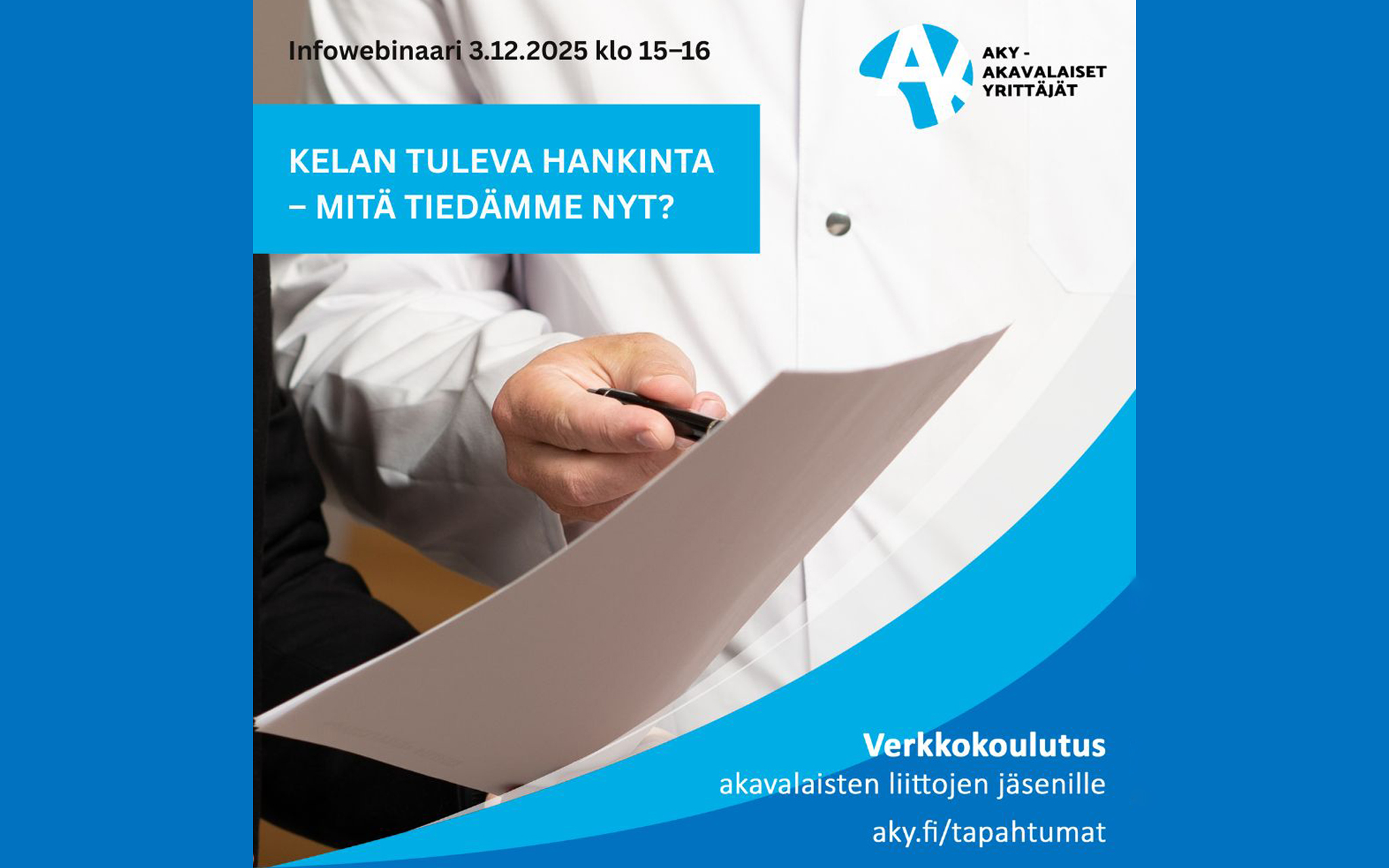 AKY – Akavalaiset yrittäjät ry:n soteliitot järjestävät keskiviikkona 3.12. yhteisen infowebinaarin Kelan tulevasta yksilöllisen vaativan lääkinnällisen kuntoutuksen hankinnasta.