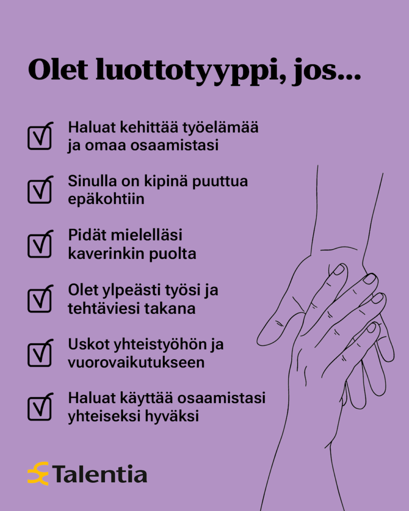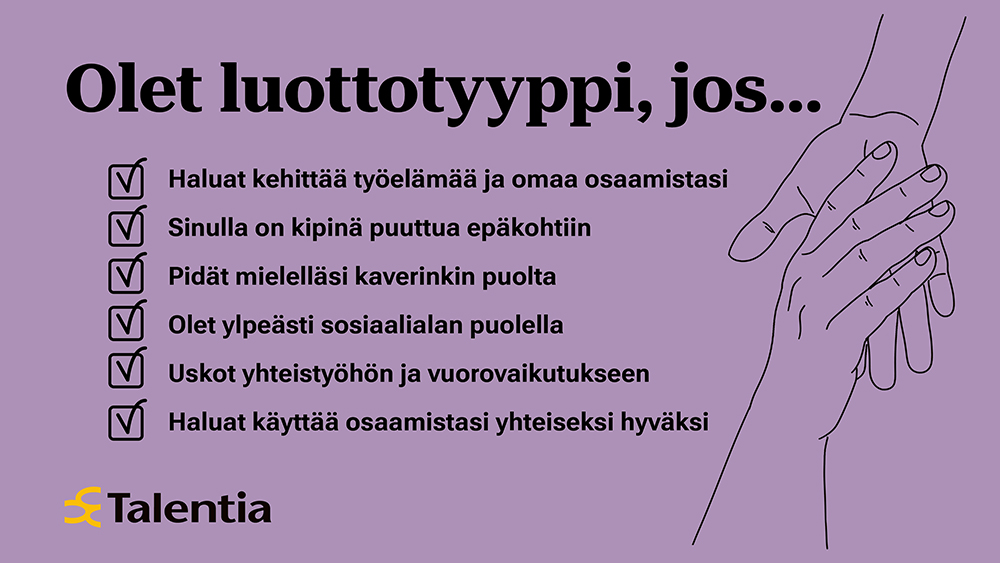 Jos tunnistat itsesi näistä kuvailuista, olet työntekijöiden etujen puolustaja eli luottotyyppi! Juuri kaltaisiasi Talentia etsii ehdolle kuntien luottamusedustajavaaleihin.