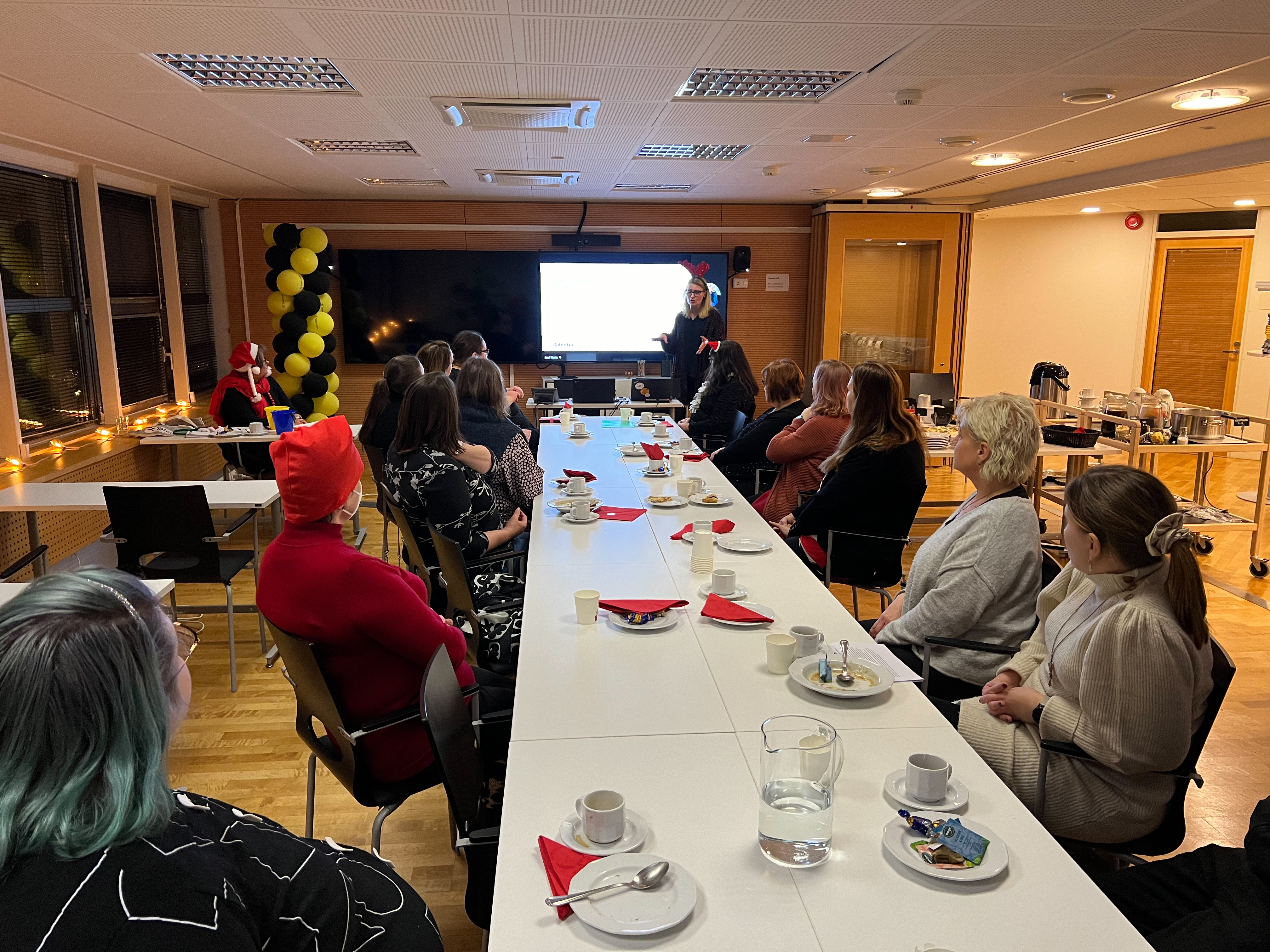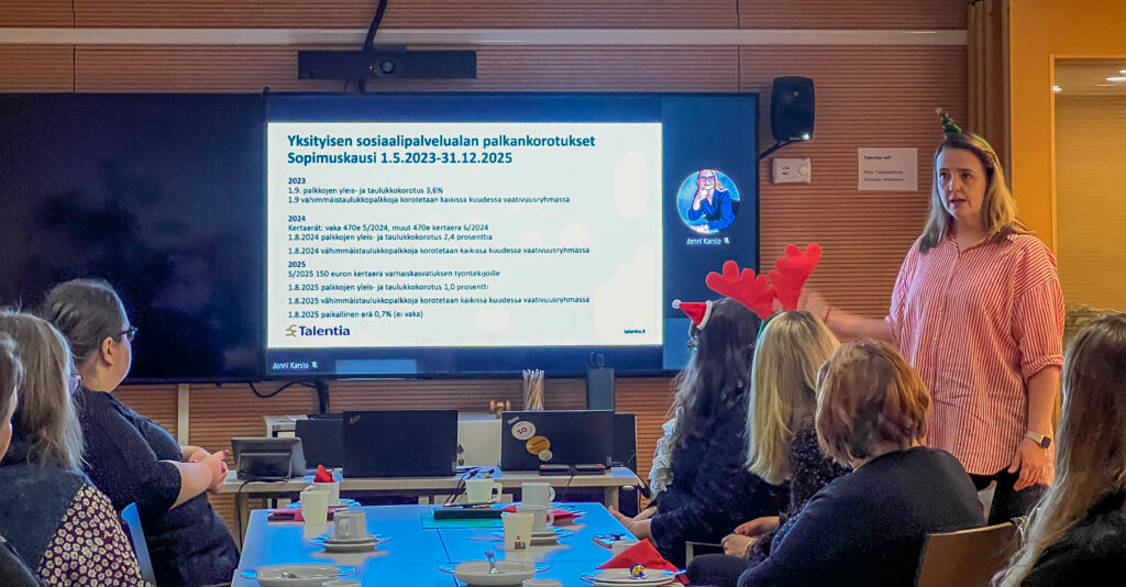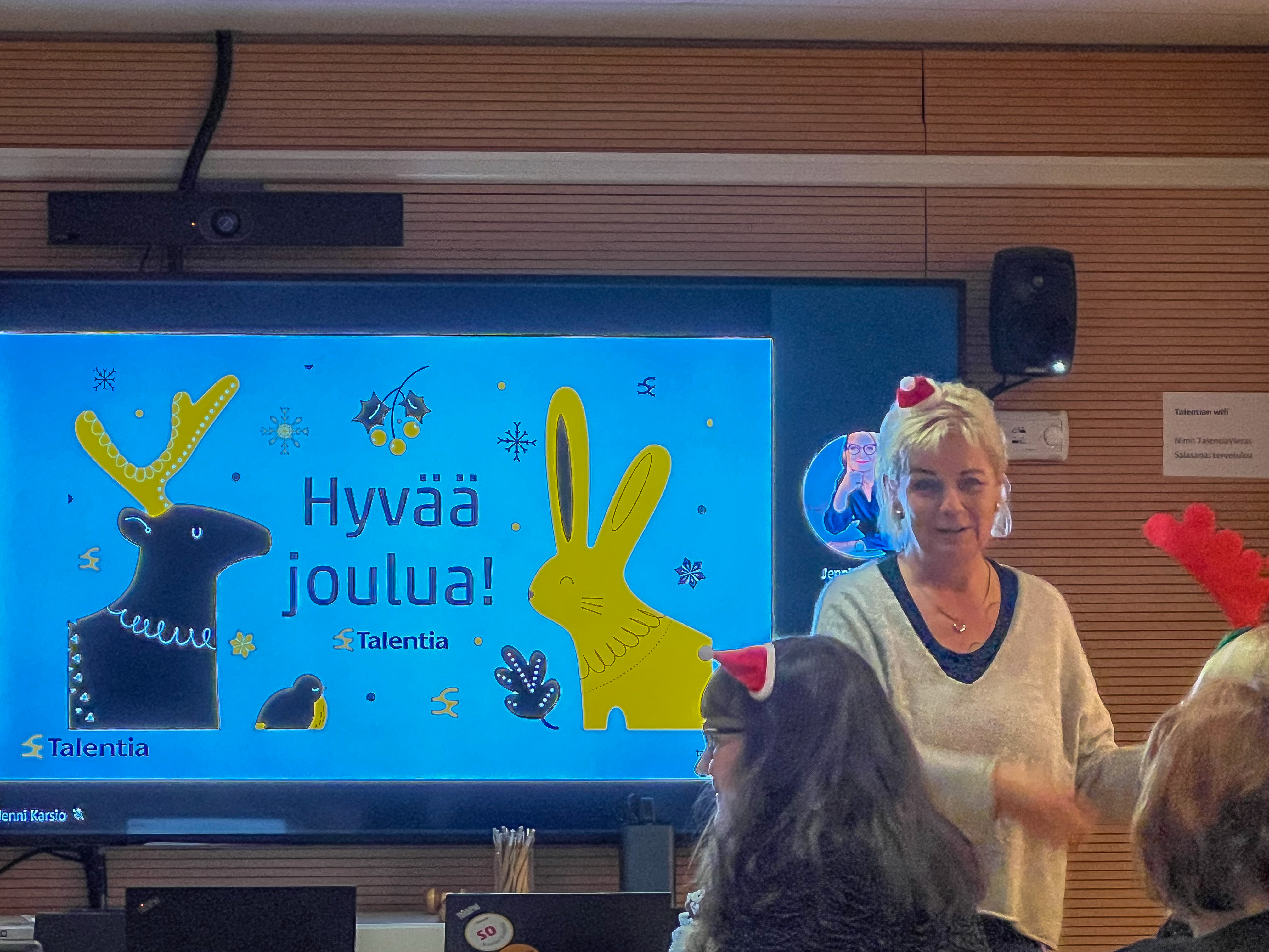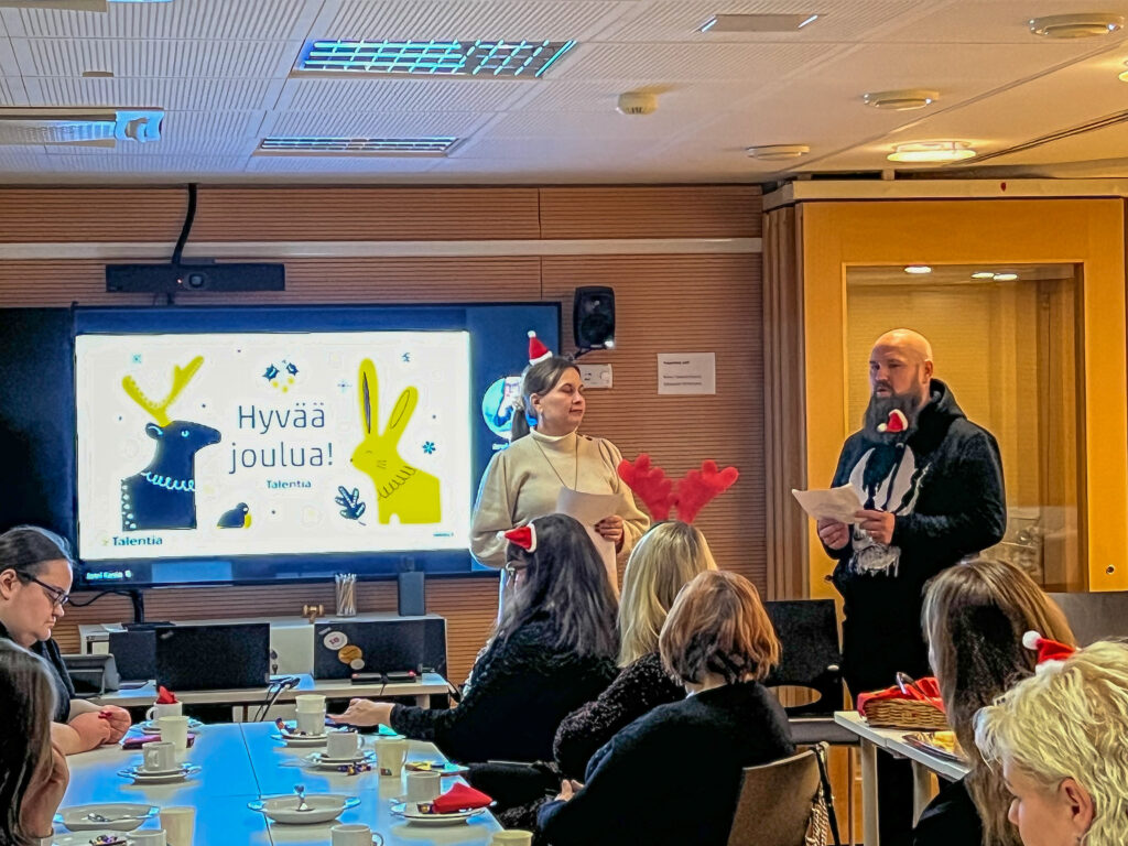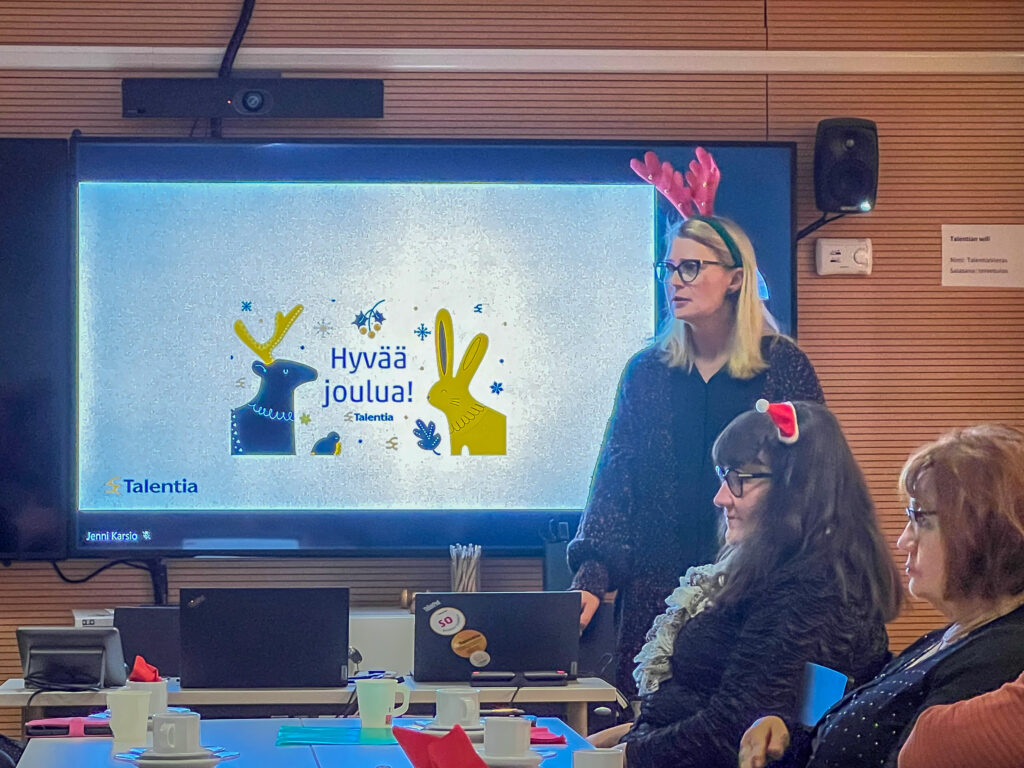 Syömisten jälkeen pikkujoulun vierailijat Talentia ry:n puheenjohtaja Jenni Karsio, sopimusasiantuntija Johanna Rantanen sekä alueemme Talentialaiset luottamusmiehet Minni Marttinen-Forsman, Anna-Sofia Salomaa ja Jani Puskala kertoivat Talentian tekemästä edunvalvonnasta- ja vaikuttamistyöstä.